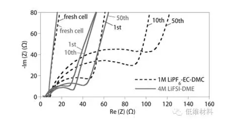 實驗以Cu-LiFePO4電池為研究體系,分別選用1 M LiPF6-EC/DMC(1/2 v/v)酯類電解液和4 MLiFSI-DME醚類電解液進行對比。實驗結果表明隨著循環(huán)次數(shù)增加,酯類電解液環(huán)境下電池電阻增加明顯,而4 MLiFSI-DME醚類電解液環(huán)境下,電阻增幅較小。