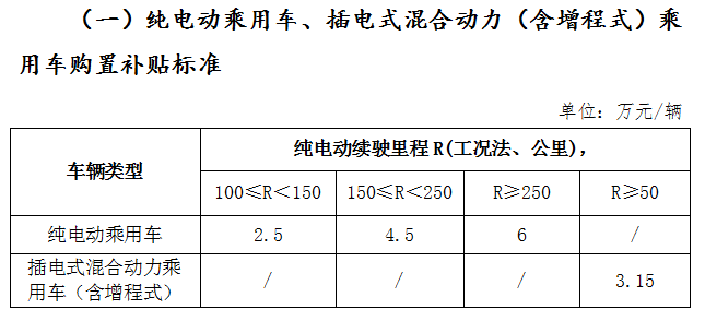 1.純電動乘用車。100≤R<150公里(R為標(biāo)準(zhǔn)工況續(xù)駛里程,單位:公里,下同)2.5萬元/輛,150≤R<250公里4.5萬元/輛,R≥250公里6萬元/輛。
