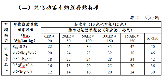3.純電動客車。對R≥250公里的標(biāo)準(zhǔn)車(指10米<L≤12米,L為車身長度,下同),50萬元/輛;6米<L≤8米客車按照標(biāo)準(zhǔn)車0.5倍給予補(bǔ)助;8米<L≤10米客車按照標(biāo)準(zhǔn)車0.8倍給予補(bǔ)助;12米以上、雙層客車按照標(biāo)準(zhǔn)車1.2倍給予補(bǔ)助。
