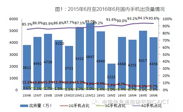 2016年6月,4G手機(jī)出貨量4170.7萬部,上市新機(jī)型122款,同比分別增長(zhǎng)28.3%和35.6%,占比分別為93.6%和88.4%。1-6月,4G手機(jī)出貨量2.33億部,上市新機(jī)型649款,同比分別增長(zhǎng)19.8%和17.6%,占比分別為92.0%和85.1%。
