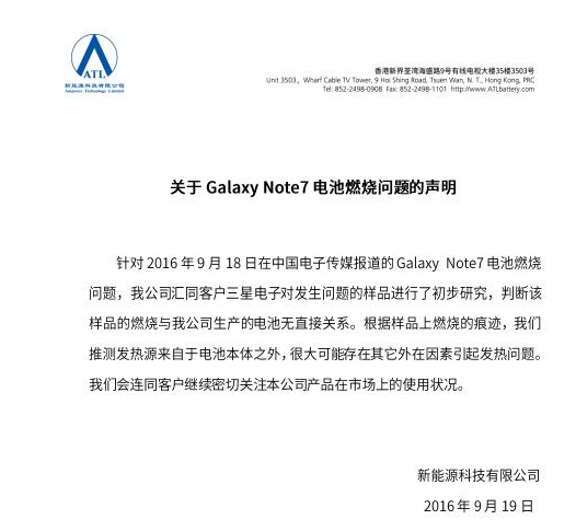 9月19日消息,針對(duì)昨日網(wǎng)傳的國(guó)行三星Note7爆炸事件,電池供應(yīng)商ATL新能源科技發(fā)布聲明稱(chēng),樣品燃燒與該司生產(chǎn)的電池?zé)o直接關(guān)系。