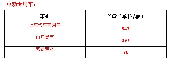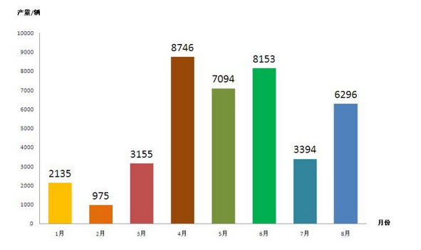 電動(dòng)專用車:8月份產(chǎn)量并不理想,其中上海汽車商用車的產(chǎn)量為347輛、山東昊宇和蕪湖寶騏產(chǎn)量分別為197、76輛,電動(dòng)專用車在8月份的產(chǎn)量陷入低迷。