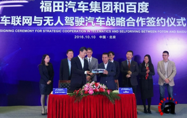 2016年10月10日,福田汽車集團(tuán)在北京與百度簽署戰(zhàn)略合作協(xié)議,將就車聯(lián)網(wǎng)、大數(shù)據(jù)、智能汽車和無(wú)人駕駛展開(kāi)全面合作,共同打造面向未來(lái)的智能互聯(lián)網(wǎng)商用汽車。