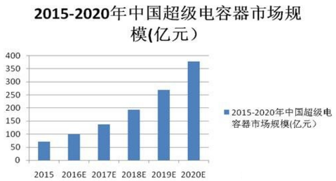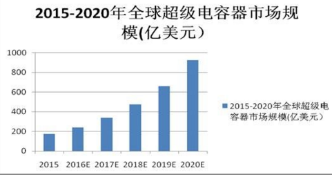 2015年全球超級電容器市場規(guī)模達(dá)到173億美元,分析機(jī)構(gòu)預(yù)計(jì),到2020年超級電容器市場將超923億美元,年均復(fù)合增長率達(dá)到39%。
