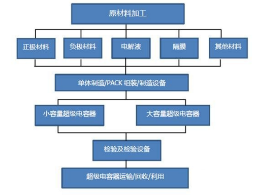 超級電容器產(chǎn)業(yè)鏈中,生產(chǎn)環(huán)節(jié)的原材料主要是正負(fù)電極/電解液和隔膜。其中雙電層電容器的電極活性材料多為活性炭,其產(chǎn)業(yè)化技術(shù)主要掌握在西方發(fā)達(dá)國家手中。隔膜技術(shù)掌握在日本企業(yè)手中。電解液方面,國內(nèi)暫無技術(shù)瓶頸。而其制作工藝:配料→混漿→ 制電極→裁片→組裝→注液 →活化→檢測→包裝,整套流程的技術(shù)含量頗高,準(zhǔn)入門檻較高。