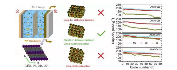 研究發(fā)現(xiàn),當(dāng)碳微球的添加量過少時,反而會造成富鋰材料的納米顆粒發(fā)生團聚,而碳微球過多時則會造成材料的顆粒過于松散,添加10wt%碳微球的富鋰材料具有最好的循環(huán)性能、倍率性能和最少電壓衰降。