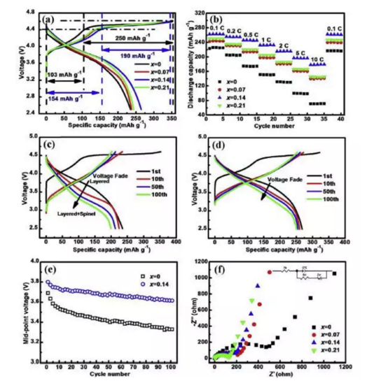 哈爾濱工業(yè)大學(xué)的Quanxin Ma等人針對富鋰材料這些問題進(jìn)行了摻雜改性實驗。Quanxin Ma通過向富鋰材料中加入Se元素合成了Li1.2[Mn0.7Ni0.2Co0.1]0.8_xSexO2,實驗表明該材料具有良好的倍率性能,在10C的倍率下,比容量可達(dá)178mAh/g,并且Se元素?fù)诫s很好的抑制了富鋰材料的電壓衰降,循環(huán)100次,中值電壓衰降僅為5%。
