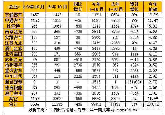1-10月,純電動客車行業(yè)增幅進(jìn)一步縮窄,從1-9月的64%縮小到1-10月的34%,縮窄了30個百分點(diǎn);全行業(yè)1-10月累計產(chǎn)車55791輛,凈增量只有1.5萬輛左右。盡管多數(shù)企業(yè)累計產(chǎn)量增速還是正值,比如宇通生產(chǎn)純電動客車11091輛保持第一,同比增長30%;中通以8585輛和70%增幅穩(wěn)定居于第二;比亞迪增長107%,累計生產(chǎn)3242輛居第三;南京金龍以2814輛居第五;安凱客車生產(chǎn)2700輛居第六,同比增長266%——但行業(yè)的整體后市發(fā)展不容樂觀。