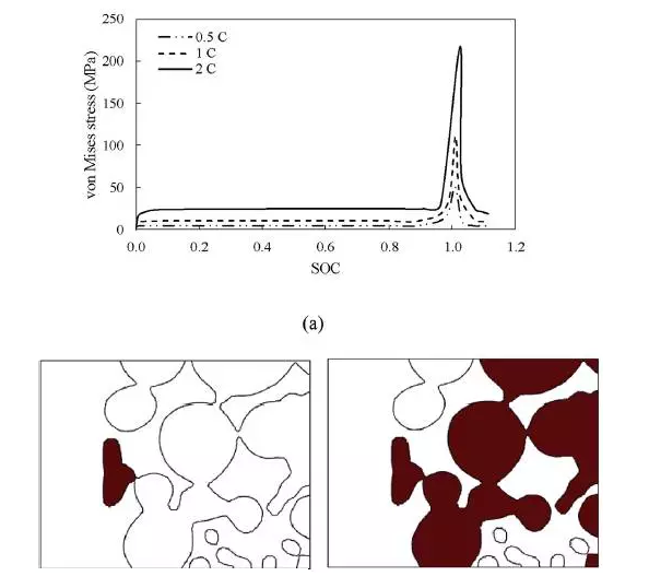 研究發(fā)現(xiàn),在充放電過程中,顆粒凹陷和凸出部分所承受的應力最大,由于應力的作用,顆粒的連接處可能發(fā)生斷裂,從而產(chǎn)生與導電網(wǎng)絡絕緣的顆粒,導致容量損失。而連接斷裂但是沒有與導電網(wǎng)絡絕緣的顆粒,更容易在顆粒的表面產(chǎn)生裂紋。在長期的循環(huán)中,由于顆粒內(nèi)部的相變的累積,也會造成材料顆粒的應力逐漸增加,影響材料的長期循環(huán)穩(wěn)定性。