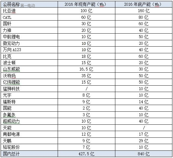 表2 國(guó)內(nèi)主流動(dòng)力電池企業(yè)產(chǎn)能情況