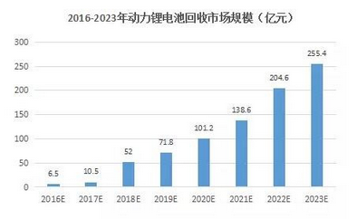 新能源汽車市場2014年開始高速增長,而新能源汽車早在2008年奧運(yùn)會期間就已出現(xiàn),按照相應(yīng)的報廢標(biāo)準(zhǔn),動力電池報廢電池市場已經(jīng)開始形成,預(yù)計到2018年中國動力電池廢舊回收市場將初具規(guī)模,累計廢舊動力電池12.08GWH,累計報廢量將達(dá)到17.25萬噸左右。根據(jù)測算,2018年對應(yīng)的從廢舊動力鋰電池中回收鈷、鎳、錳、鋰、鐵和鋁等金屬所創(chuàng)造的回收市場規(guī)模將達(dá)到53.23億元,2020年達(dá)到101億元,2023年廢舊動力鋰電池市場將達(dá)到250億元。