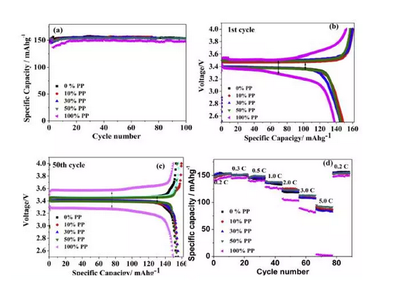 PEDOT:PSS因?yàn)槠淞己玫膶?dǎo)電性,熱/化學(xué)穩(wěn)定性而被廣泛的應(yīng)用在鋰離子電池領(lǐng)域,例如Si負(fù)極電池等。Haoxiang Zhong將PEDOT:PSS與CCTS結(jié)合,應(yīng)用在LiFePO4材料電極上,并研究了PEDOT:PSS與炭黑之間的替代關(guān)系,發(fā)現(xiàn)PEDOT:PSS與炭黑之間的重量比例為1:1時(shí)電池表現(xiàn)出最好的倍率和循環(huán)性能。實(shí)驗(yàn)過程如下,首先將PEDOT:PSS分散在CCTS溶液中,然后再與LiFePO4、炭黑和粘結(jié)劑(SBR)混合,然后涂布再鋁箔上進(jìn)行后續(xù)的電化學(xué)測(cè)試。