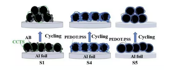 采用PEDOT:PSS材料能夠在電極內(nèi)部形成連續(xù)的均勻的導(dǎo)電網(wǎng)絡(luò),并能夠降低了導(dǎo)電劑炭黑的應(yīng)用,從而提升電極的壓實(shí)密度。采用PEDOT:PSS導(dǎo)電劑的LiFePO4電池表現(xiàn)出了更好的循環(huán)性能和倍率性能。