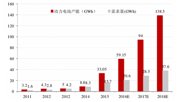 中國(guó)動(dòng)力電池產(chǎn)能與需求對(duì)比