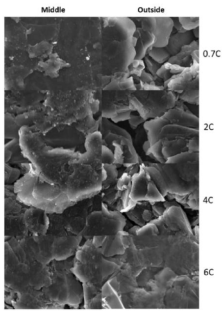 通過拆解循環(huán)后的電池,隨著充電速率的增加,負(fù)極的顏色也發(fā)生了改變,在0.7C和2C的充電倍率下,電極呈現(xiàn)了均一的顏色,而到充電倍率提高到4C,電極的中間位置呈現(xiàn)出了灰色,而在6C的倍率下,不但中間部分的電極呈現(xiàn)除灰色,中間部分的活性物質(zhì)還出現(xiàn)了脫落的現(xiàn)象。SEM掃描發(fā)現(xiàn),在0.7C和2C的倍率下,電極表面呈現(xiàn)除原始的狀態(tài),但是在4C的倍率下,電極表面開始出現(xiàn)一些亮點(diǎn),6C的倍率下,電極的表面狀態(tài)則明顯不同了,由于SEI膜厚度的增加,已經(jīng)難以分辨單獨(dú)的石墨顆粒了。