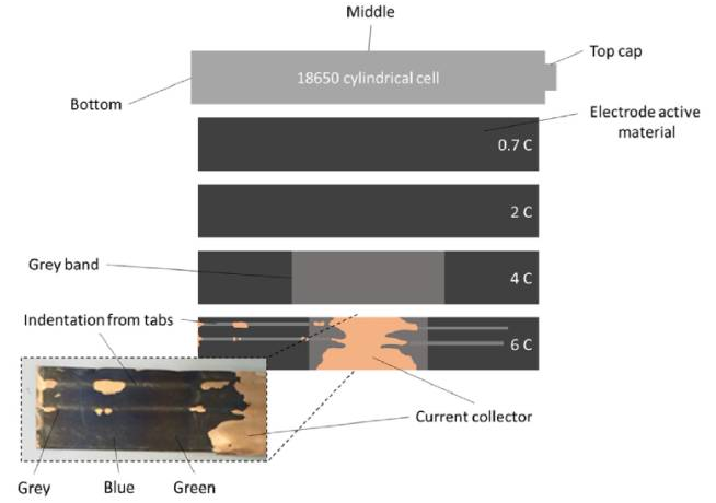 實(shí)驗(yàn)中L. Somerville采用了商業(yè)的NMC/石墨18650電池,以盡可能還原商用鋰離子電池中石墨負(fù)極的工作狀態(tài)。充電速率被設(shè)定為0.7,2,4,6C,放電速率為C/3,電池溫度控制在25℃。