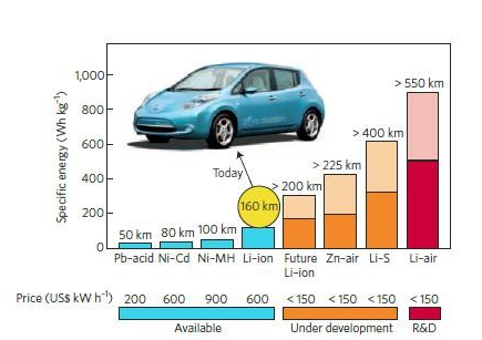 由于汽油等化石燃料的消耗和污染,人類需要新型可替代能源。但目前鋰離子電池(LiCoO2材料)250 Wh/kg的能量密度與汽油1750 Wh/kg的指標相差太大,不能滿足日常需求。