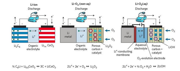 圖1:LiCoO2型鋰離子電池與Li-O2 電池的反應機理圖