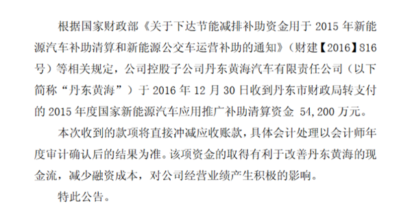 曙光股份晚間發(fā)布公告,公司控股子公司丹東黃海12月30日收到丹東市財政局轉(zhuǎn)支付的2015年度國家新能源汽車應(yīng)用推廣補助清算資金5.42億元。