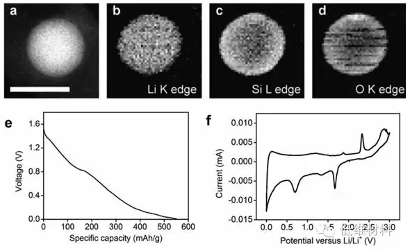 圖2.(a)嵌鋰二氧化硅的STEM圖和(b)Li,(c)Si,(d)O 分布的EELS圖.(e)二氧化硅納米顆粒的放電曲線.(f)二氧化硅納米顆粒的CV曲線.