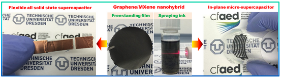 德累斯頓工業(yè)大學(xué)馮新亮教授,莊小東博士和中國(guó)科學(xué)院長(zhǎng)春應(yīng)用化學(xué)研究所牛利研究員(共同通訊作者)以此為著眼點(diǎn),合作制備了基于MXene和電化學(xué)剝離的石墨烯納米復(fù)合物薄膜電極,并將其應(yīng)用到傳統(tǒng)的固態(tài)超級(jí)電容器和平面的微型超級(jí)電容器中。
