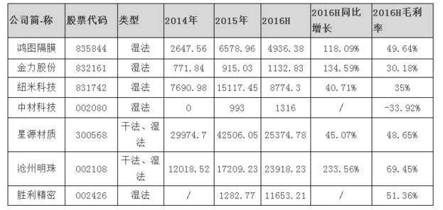 受下游應(yīng)用快速增長(zhǎng)的影響,2015年鋰電池濕法隔膜企業(yè)營(yíng)收均取得了較好的市場(chǎng)表現(xiàn),同比增長(zhǎng)大多在50%。從2016年上半年各企業(yè)營(yíng)收情況來(lái)看,濕法隔膜類上市公司成長(zhǎng)性及毛利率都處于較高水平。