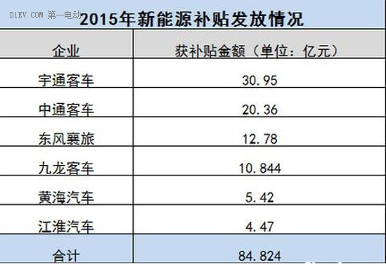 據統(tǒng)計,截止目前,共有6家企業(yè)獲得2015年國家新能源補助,累計金額84.8億元,發(fā)放情況見下表: