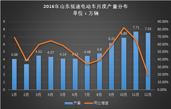 從山東低速電動車月度產(chǎn)出看,2016年前8月保持平穩(wěn),產(chǎn)出維持在4萬輛左右,從9月開始進入微型電動車產(chǎn)銷增長期,與往年規(guī)律相似,在第四季度產(chǎn)銷量保持高位增長,最高在11月形成產(chǎn)量高峰達7.71萬輛,同比增長近70%,12月出現(xiàn)小幅下滑,但依舊保持7.5萬輛水平。此前全年山東微型電動車產(chǎn)量可以突破60萬輛的預(yù)期得以實現(xiàn)。