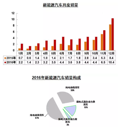 1月12日,中國(guó)汽車(chē)工業(yè)協(xié)會(huì)對(duì)外發(fā)布的數(shù)據(jù)顯示, 2016年新能源汽車(chē)生產(chǎn)51.7萬(wàn)輛,銷(xiāo)售50.7萬(wàn)輛,比上年同期分別增長(zhǎng)51.7%和53%。
