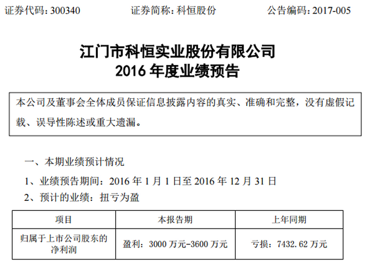 1月18日,科恒股份(300340)發(fā)布業(yè)績(jī)預(yù)告,公司預(yù)計(jì)2016年1-12月份歸屬于上市公司股東的凈利潤(rùn)3000萬(wàn)至3600萬(wàn)元,同比增長(zhǎng)140.36%至148.44%,對(duì)公司股價(jià)構(gòu)成重大利好,其他電子行業(yè)平均凈利潤(rùn)增長(zhǎng)率為34.34%,公司本季度凈利潤(rùn)環(huán)比上季度增長(zhǎng)1291.86%至1637.53%。