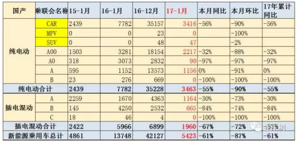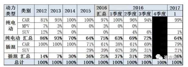 2017年1月純電動乘用車中基本是轎車產品,前期的MPVSUV逐步萎縮,這也是電池影響的新能源車產品升級放緩。