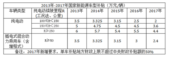 2013年-2017年國家新能源車型補(bǔ)貼(萬元/輛)一覽