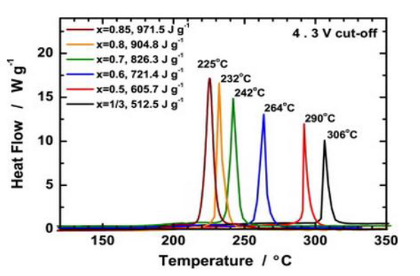 而且隨著NCM能量密度的不斷提高,材料的熱穩(wěn)定性會(huì)越來越差。下圖表述的是隨著Ni含量的升高材料的分解溫度逐漸下降。