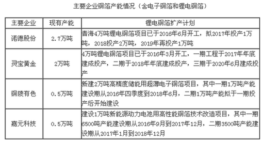 1) 目前鋰電銅箔的產(chǎn)能主要集中在諾德股份、靈寶黃金兩大企業(yè)手中,主要企業(yè)銅箔產(chǎn)能情況如下表所示。