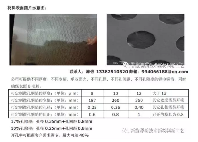 現(xiàn)階段,鋰離子電池生產(chǎn)使用的常規(guī)銅箔厚度8μm~12μm(3C數(shù)碼類電池用銅箔已有采用6~7μm銅箔),鋁箔的厚度12μm~20μm,作為正負(fù)極導(dǎo)電基材占鋰離子電池重量的15%~20%,如何進(jìn)一步降低銅鋁箔的重量比從而提升比能量呢?于是,微孔銅箔鋁箔就是在這樣的環(huán)境刺激下孕育而生,橫空出世!(不會(huì)牛B吹大了吧?)