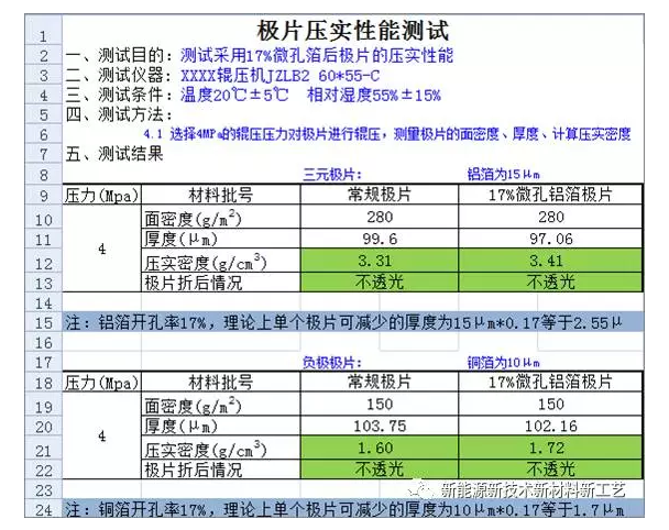 同等規(guī)格的箔材,孔隙率17%的微孔箔,重量減少17%;同等面密度,正負(fù)極壓實(shí)提高(部分材料填充進(jìn)入孔隙間)。