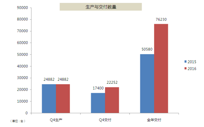 特斯拉第四季度生產(chǎn)了 24882 臺(tái)電動(dòng)車,較上一季度的產(chǎn)量下滑 1% ,較上年同期增長(zhǎng)了 77% 。特斯拉第四季度交付了 22252 臺(tái)電動(dòng)車,較上一季度減少 10% ,較上年同期增長(zhǎng) 27% 。全年交付量為 76230 臺(tái),同比提升 50% 。2016 年三季度,特斯拉在交付量和盈利方面都出現(xiàn)了歷年之最,但四季度隨著自動(dòng)駕駛系統(tǒng)開始在量產(chǎn)車上進(jìn)行安裝搭載,交付量隨之收到影響,也導(dǎo)致全年銷量目標(biāo)未能完成。