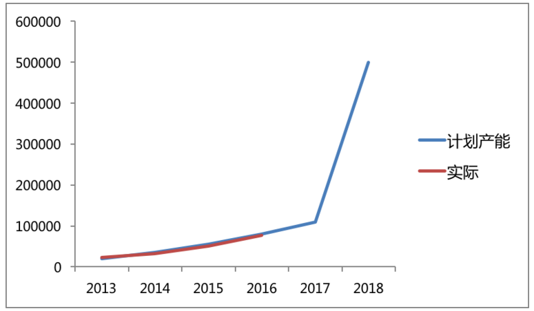 如果畫一條特斯拉的產(chǎn)能曲線,那么這條曲線在 2017 年到 2018 年的分界點(diǎn)上將會(huì)出現(xiàn)一個(gè)驚人的陡升。比如這樣: