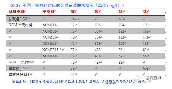 不同正極材料的金屬需求情況見表3。正極材料企業(yè)在具體生產(chǎn)時會存在一定的浪費(fèi),據(jù)咨詢企業(yè)人士,他們說可以大致按5-6%計(jì)算。不過,正極材料企業(yè)的成品率可能也是一個問題,不合格產(chǎn)品中的資源回收情況如何,電池生產(chǎn)對于正極材料的利用率如何,等等,這些問題真鋰研究目前正在想辦法了解清楚。