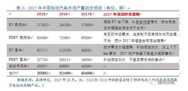 在燃料與積分辦法的壓力下,今年合資車企很可能加大電動乘用車產(chǎn)品的開發(fā)力度,考慮到這個因素,2017年EV乘用車的發(fā)展速度有可能會比表中預(yù)測要快一些,我們對該類車的上限預(yù)測數(shù)值是40萬輛。基于此,真鋰研究對今年新能源汽車的銷量初步預(yù)測是60.4-63.4萬輛之間。