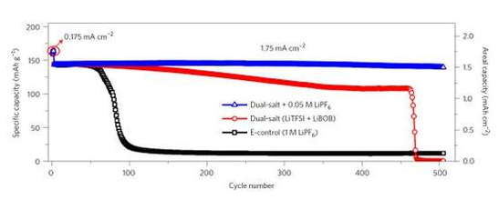 上方圖示顯示了PNNL將化學(xué)添加劑六氟磷酸鋰加入雙鹽基/碳酸溶劑電解質(zhì)后,鋰金屬電池的循環(huán)穩(wěn)定性將提升,充電速度加快,電壓較高,充電間隔期更長。