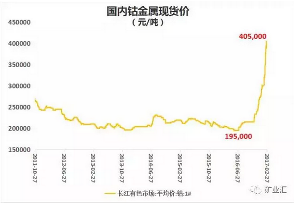 進(jìn)入2017年,金屬鈷價(jià)格暴漲至40萬(wàn)元/噸,較年初增長(zhǎng)近一倍,甚至引起發(fā)改委重視,開始著手調(diào)查近期大宗商品期貨的上漲是否涉及投機(jī)性炒作和擾亂市場(chǎng)價(jià)格秩序的行為。