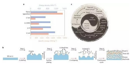 c.金屬鋰負(fù)極的不同挑戰(zhàn)之間的聯(lián)系,源于高的反應(yīng)活性和極大的相對體積變化
