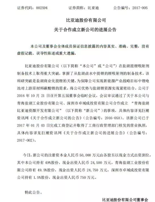 3月15日,比亞迪股份有限公司發(fā)布了關(guān)于合作成立新公司的進展公告。根據(jù)公告,成立的新公司名稱為“青海鹽湖比亞迪資源開發(fā)有限公司”,股東由比亞迪股份有限公司、青海鹽湖工業(yè)股份有限公司、深圳市卓域成投資有限公司構(gòu)成。新公司的注冊資本金為人民幣5億元,由各股東以現(xiàn)金方式出資到位,其中比亞迪持股 49%,現(xiàn)金出資人民幣 24,500萬元,青海鹽湖工業(yè)股份有限公司持股 49.5%,現(xiàn)金出資人民幣 24,750 萬元,深圳市卓域成投資有限公司持股1.5%,現(xiàn)金出資人民幣750萬元。新公司的經(jīng)營范圍包括鹽湖鋰資源的開發(fā)、生產(chǎn)與銷售,產(chǎn)品包括碳酸鋰和氫氧化鋰等。而新公司的成立也將為比亞迪在新能源產(chǎn)業(yè)戰(zhàn)略目標中鋰電池對上游原材料碳酸鋰的需求提供保障。