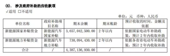 在新能源汽車補貼方面,報告顯示新能源汽車國家和地方補貼應(yīng)收款總計43.87億元。其中新能源汽車國家補貼,2016年末余額36.57億元;新能源汽車地方補貼,2016年末余額7.3億元,期末賬齡為2年以內(nèi)。