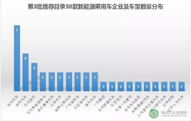 入選第3批推薦目錄的38款新能源乘用車來自20家企業(yè):東風汽車最多,達7款。其次分別為:吉利汽車(4款)、北汽股份(3款)、北汽新能源常州(2款)、浙江豪情汽車(2款)、江淮汽車(2款)、湖南江南汽車(2款)、廣汽乘用車(2款)、比亞迪汽車(2款)、海馬汽車(2款)、一汽集團(1款)、東風裕隆汽車(1款)、北京現(xiàn)代(1款)、天津一汽夏利(1款)、東風悅達起亞(1款)、東南(福建)汽車(1款)、上汽通用五菱汽車(1款)、四川野馬汽車(1款)、江鈴控股(1款)、江蘇九龍汽車(1款)。