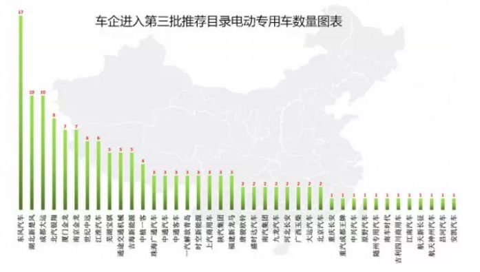 分企業(yè)看,有40家電動專用車生產企業(yè)進入,它們的電動專用車進入情況如下:東風汽車(17款),湖北新楚風(10款),成都大運(10款),北汽銀翔(8款),廈門金龍(7款),南京金龍(7款),世紀中遠(6款),江淮汽車(6款),蕪湖寶騏(5款),通途交通機械(5款),吉海新能源(5款),中植一客 (4款),珠海廣通汽車(3款),中通汽車(3款),中通客車(3款),一汽解放青島(3款),時空新能源(3款),上汽商用車(3款),陜汽集團(3款),福建新龍馬(3款),唐駿歐鈴(2款),盛時達汽車(2款),南汽集團(2款),九龍汽車(2款),河北長安(2款),廣西玉柴(2款),大運汽車(2款),北京汽車(2款),重慶長安(1款),重汽成都王牌(1款),中興汽車(1款),原野汽車(1款),隨州專用汽車(1款),南車時代(1款),吉利四川商用車(1款),江南汽車(1款),航天新長征(1款),航天神州汽車(1款),昌河汽車(1款),安凱汽車(1款)。