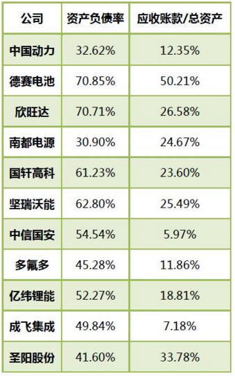 資金風(fēng)險(xiǎn)方面,從資產(chǎn)負(fù)債率看,目前11家上市公司資金情況總體良好,但德賽電池和欣旺達(dá)負(fù)債率偏高,超過了70%。另有企業(yè)在年報(bào)中提及應(yīng)收賬款回收風(fēng)險(xiǎn),11家公司應(yīng)收賬款占總資產(chǎn)的比例平均值超過20%,德賽電池這一數(shù)值超過50%。
