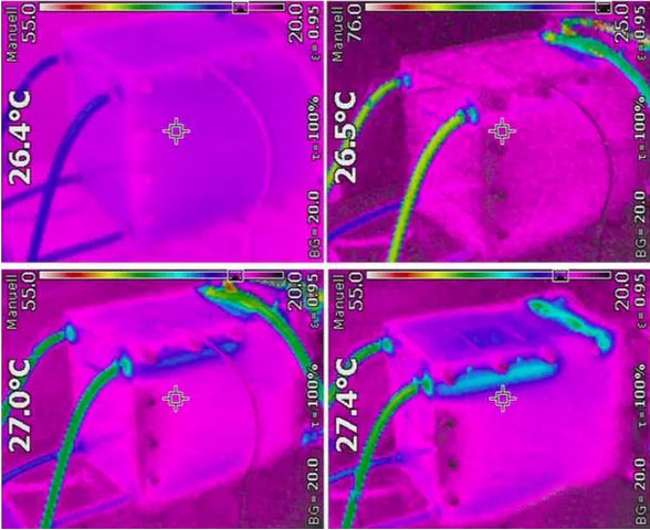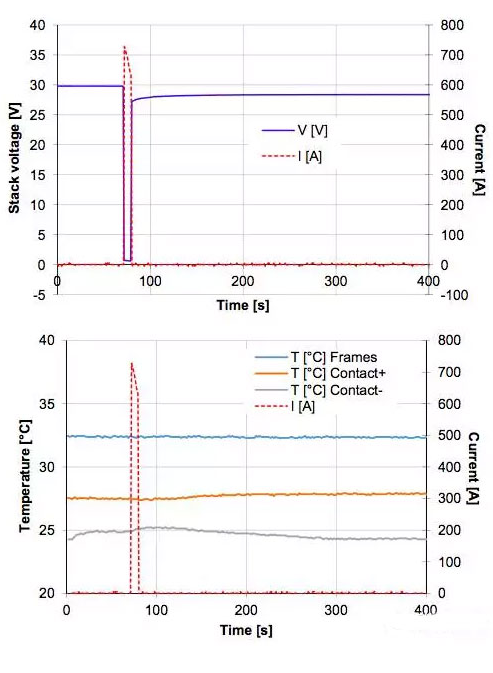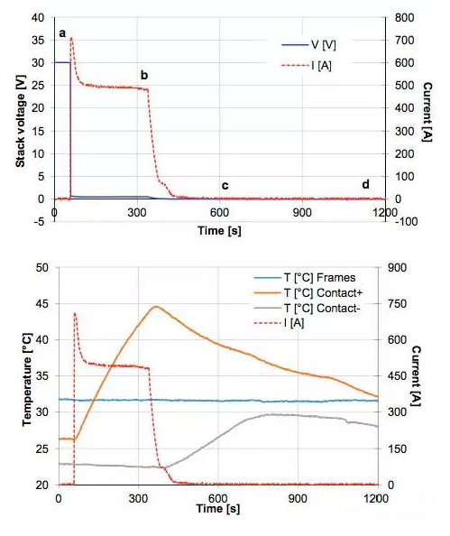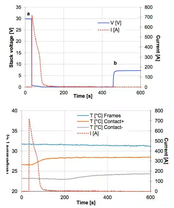 對于液流電池最危險的短路情況就是,在電解液循環(huán)泵工作的情況下發(fā)生短路,并且沒有保險絲的保護,一般來說這種情況容易在電池組維護的過程中發(fā)生。A.H.Whitehead利用20串電池對這種情況進行了模擬,短路發(fā)生后電解液循環(huán)泵將繼續(xù)工作280s(一般而言,電池管理系統(tǒng)在發(fā)現(xiàn)短路后能夠在280s內(nèi)關(guān)閉電解液循環(huán)泵),測試結(jié)果如下圖所示,在短路的瞬間電池電流超過了700A,隨后短路電流下降到490A左右,并持續(xù)到電解液循環(huán)泵關(guān)閉,電池的熱成像儀圖像如下圖所示,電池溫度升高主要在正負(fù)極接線柱上,在整個測試過程中電池沒有發(fā)生泄漏、起火等。電池在短路測試后進行的電化學(xué)測試,也表明電池性能沒有受到短路的影響。