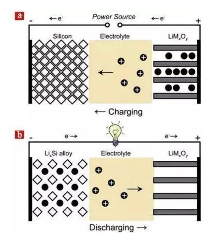 硅不具有石墨基材料的層狀結構,其儲鋰機制和其他金屬一樣,是通過與鋰離子的合金化和去合金化進行的,其充放電電極反應可以寫作下式: